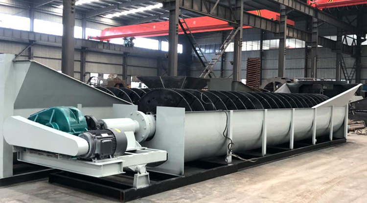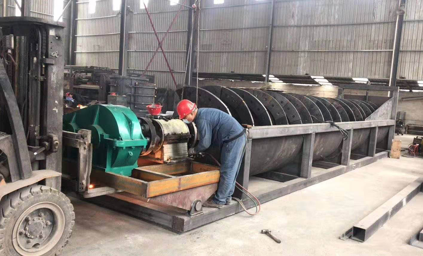 螺旋洗砂機工作時,電機通過三角帶、減速機、齒輪減速后帶動葉輪緩慢轉動,砂石有給料槽進入洗槽中,在葉輪的帶動下翻滾,并互相研磨,除去覆蓋砂石表面的雜質,同時破壞包覆砂粒的水汽層,以利于脫水;同時加水,形成強大水流,及時將雜質及比重小的異物帶走,并從溢出口洗槽排出,完成清洗作用。干凈的砂石由葉片帶走,之后砂石從旋轉的葉輪倒入出料槽,完成砂石的清洗作用。